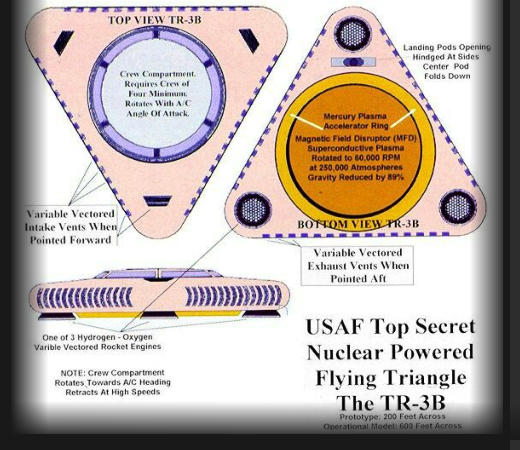 How about today…So und 12 Jahre später, wo steht der Entwicklungsstand der geheimen Back Engineering Programme des US Militärs heute ?Mit beteilingt daran sind die „DARPA“ [Link] und Lockheed Martins Entwicklungs Abteilung „Skunk Works“ [Link] .Mitte der 90er Jahre wurde das Projekt „Aurora“ gestartet, welches aus schwarzen Budgets der US Regierung finanziert wurde (Black Projects).Aus diversen Prototypen Entwicklungen, gingen sehr spezielle Flugzeuge / Flugobjekte hervoer. Darunter auch der TR-3B (dreieckige Konstruktion),der über einern Antigravitationssystem verfügt. Und dieses Objekt wurde bereits von einigen Menschen gesichtet und für ein Teil dieser Technologie wurde 2004 auch ein Patent „US20060145019A1“ eingereicht. (Also das Argiment „gibt´s nicht“ greift hier leider nicht).Da wir hier auf der Erde über kein stabiles Element 115 verfügen, haben Physiker und Ingenieure nach Alternativen gesucht und ein Antriebssystementwickelt, was mit einem antigravitations Effekt artbeitet. Gravitationswellen werden durch ein erzeugtes Kraftfeld um das Vehikle erzeugzt und die Schwerkraft wird um bis zu 95% reduziert. Im Inneren sind auch die Beschleunigungkräfte reduziert, sodass die Piloten diesen Kräften nicht aus-gesetzt sind. Dieser neuartige Antrieb soll aus einem Magnetfeldring Disruptor bestehen, indem ein Beschleuniger Ring mit einem schnell rotierenden Quecksilber-Plasma eingebunden ist. Augenzeugen berichteten übert ein tiefes, leises Brummen.Es ist davon auszugehen, dass davon mehrere TR-3B´s im Einsatz sind, primär zu Spianoge Zwecken der CIA.